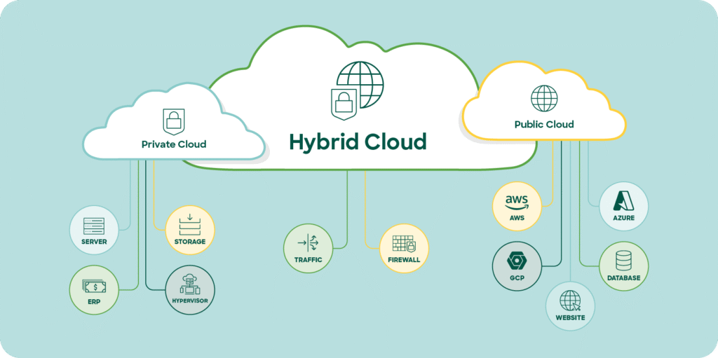 A hybrid cloud infrastructure consists of two or more distinct cloud infrastructures (private, community, or public) that remain separate, but are bound together by standardized or proprietary technology which enables data and application portability. Normally, it is a combination of public and private. A hybrid cloud is almost always a combination of public and private and is the combination considered in this section.